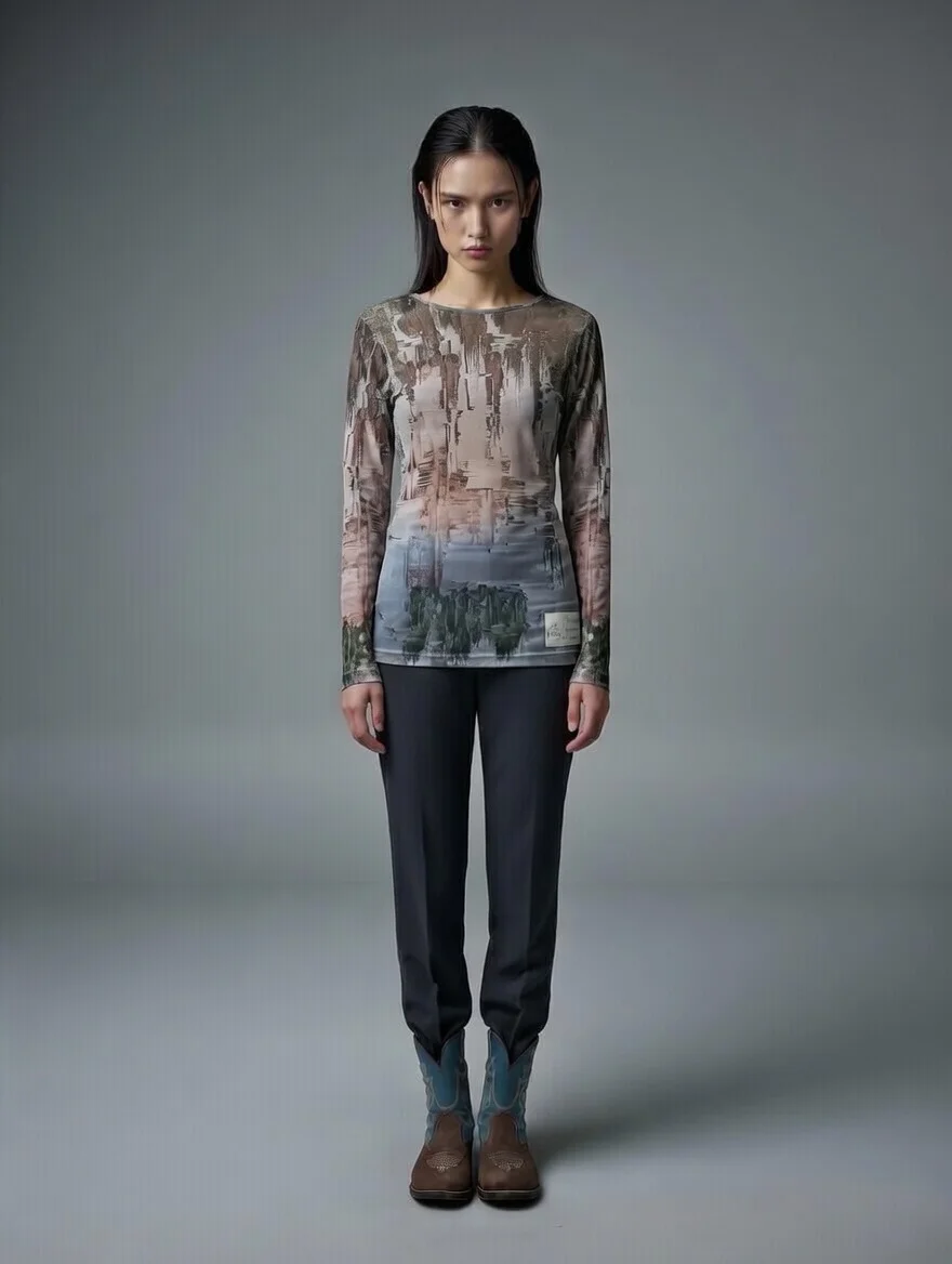 Crafted from recycled water bottle fabric, the HYPERSOMNIAZZZZ Printed Mesh Top features a fitted silhouette with long sleeves and a digitally printed landscape motif. The print distorts architectural and natural forms into mirrored, fragmented layers, creating a dreamlike, glitched visual field.