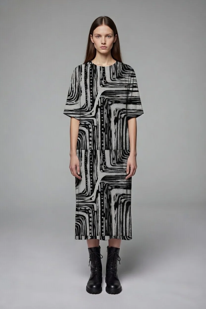 Crafted from 15 recycled water bottles, the Shuhs Slip Dress features a relaxed silhouette designed for ease and fluid movement. The abstract print adds a graphic layer to the lightweight fabric, balancing softness with quiet presence.