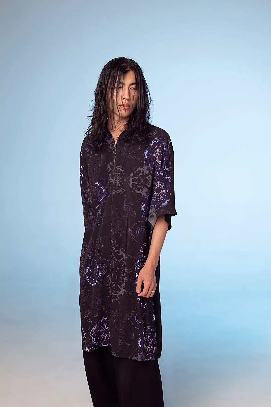 Crafted from 15 recycled water bottles, the *LLND Zip-Up Tunic features a relaxed, baggy silhouette designed for ease and movement. The zip-front construction allows for flexible styling, while the printed surface adds a graphic, directional edge.