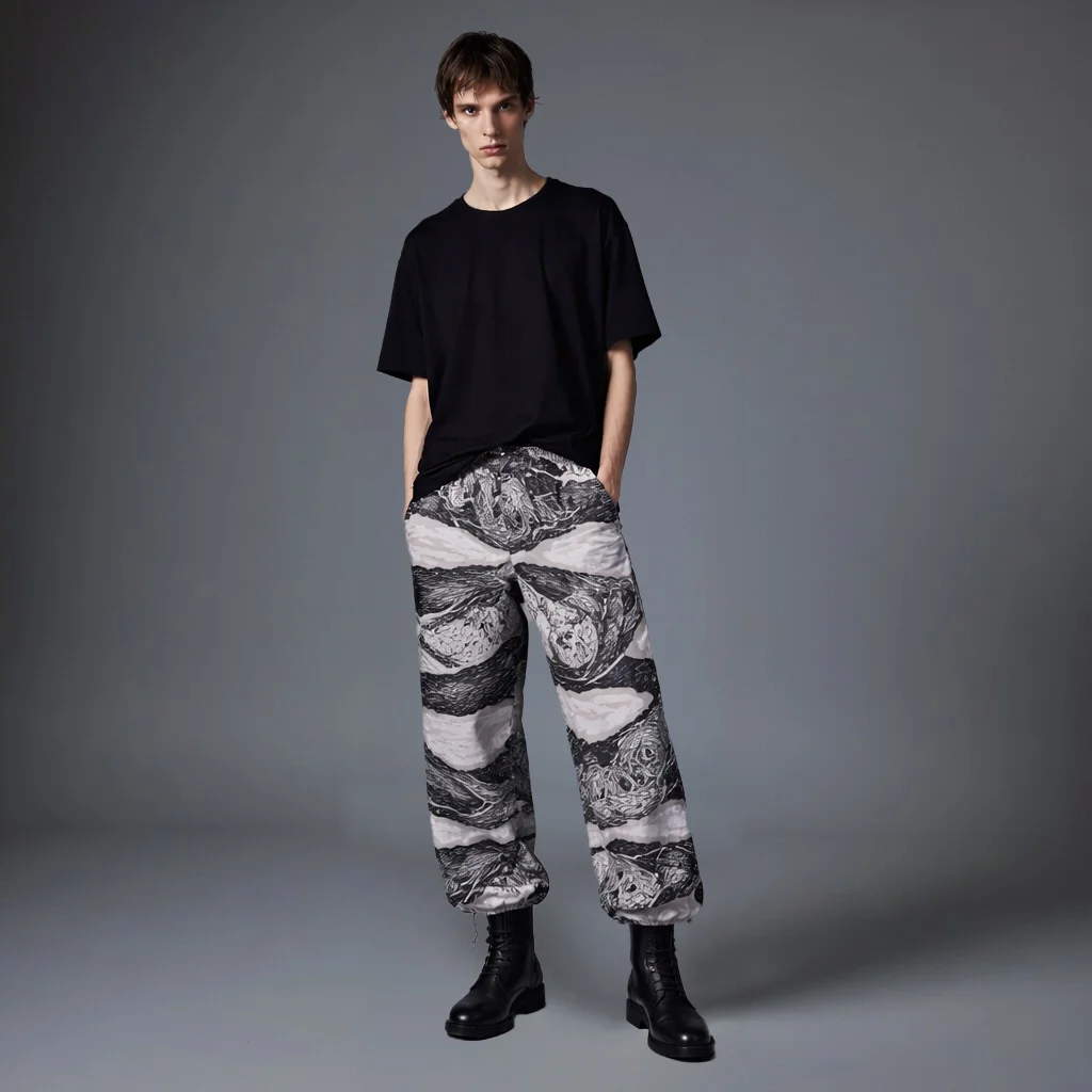 Crafted from 10 recycled water bottles, the YANG YU Parachute Pants combine lightweight structure with a relaxed, modern silhouette. Designed with a slightly voluminous fit, the pants feature a comfortable elastic waistband and subtle utility inspired details that nod to classic parachute styling. The white abstract print adds a graphic edge while keeping the look clean and versatile. Breathable, durable, and easy to move in, these pants balance sustainability with effortless contemporary style.